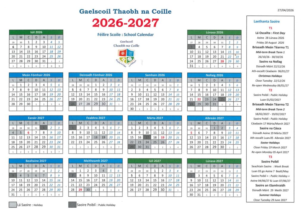 Cliceáil anseo le hÍoslódáil:     Féilire Scoile 2026/2027